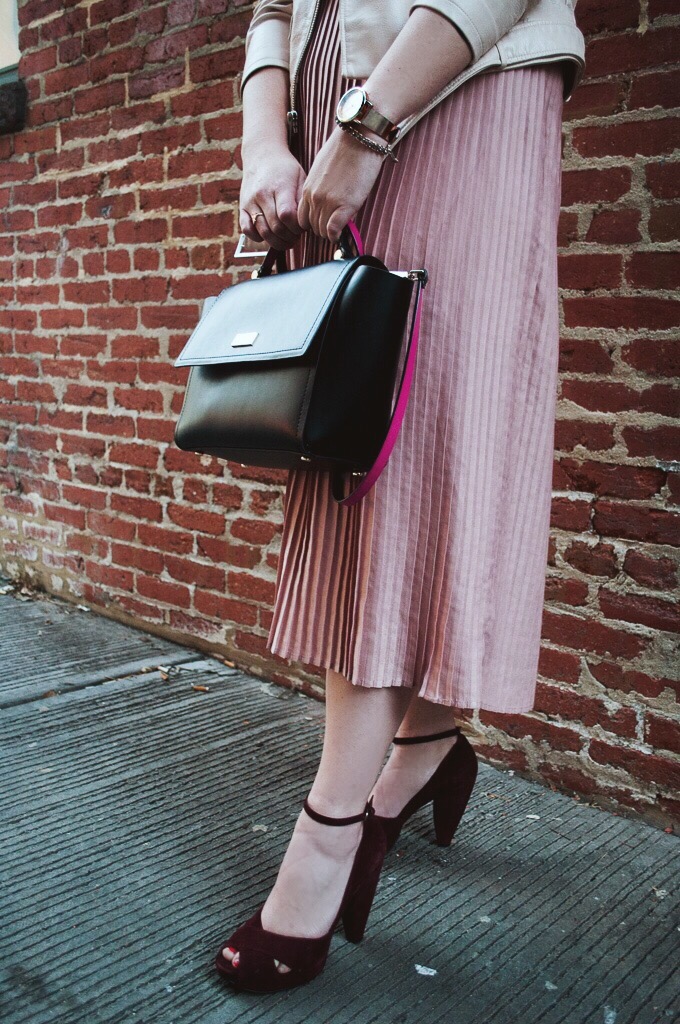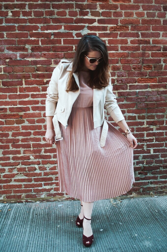 Paired with this blush cropped moto jacket from Target (similar here) and these aubergine velvet ankle strap heels, the look is lush and very Fall instead of looking too “spring.”