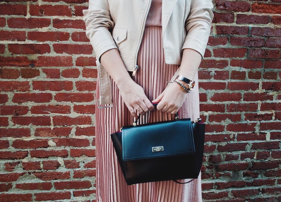 One of my favorite ways to transition between seasons is to use textures (like vegan leather or brocade) in lighter colors and use rich colors like burgundy and olive to temper pastels.