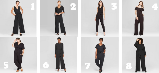1. A New Day, Sleeveless Jumpsuit, $25.58, target.com 2. Wild Fable, sleeve tie 3/4 sleeve jumpsuit, $28.50, target.com 3. ALMOST FAMOUS, Sleeveless Blazer Jumpsuit, $24.99, target.com 4. Xhileration, off the shoulder jumpsuit, $29.99 5. Ingrid & Isabel, maternity jumpsuit, $14.84, target.com 6. Who What Wear, Women’s Longsleeve Jumpsuit, $39.99, target.com 7. Ava & Viv, Plus Size Jumpsuit, $34.99, target.com 8. Who What Wear, Plus-Size Longsleeve Jumpsuit, $42.99, target.com