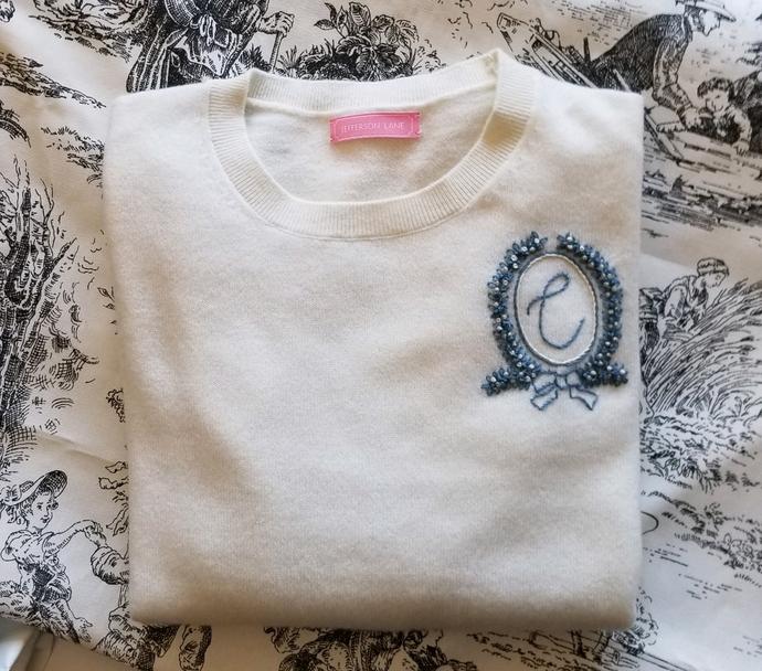 Jefferson Lane (founded and run by Julie Hunt, local to Northern VA) is a specialty online boutique that creates handcrafted bows, apparel, and unique accessories with an element of personalization and craftsmanship. Buy the Lady Eloise cashmere sweater (left). Buy the blue toile/blue gingham mask (right).